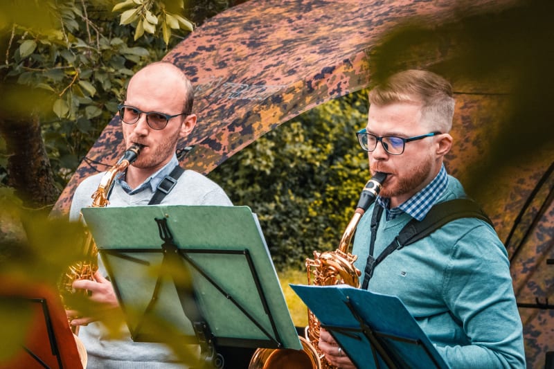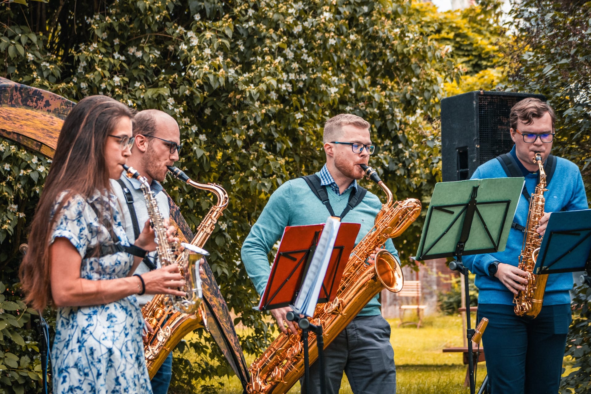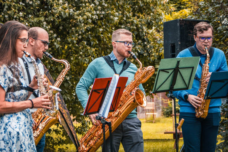 To letos možné nebude. V těchto prostojích se totiž budou na náhodných místech naší zahrady vyskytovat tito čtyři lidé se saxofony.